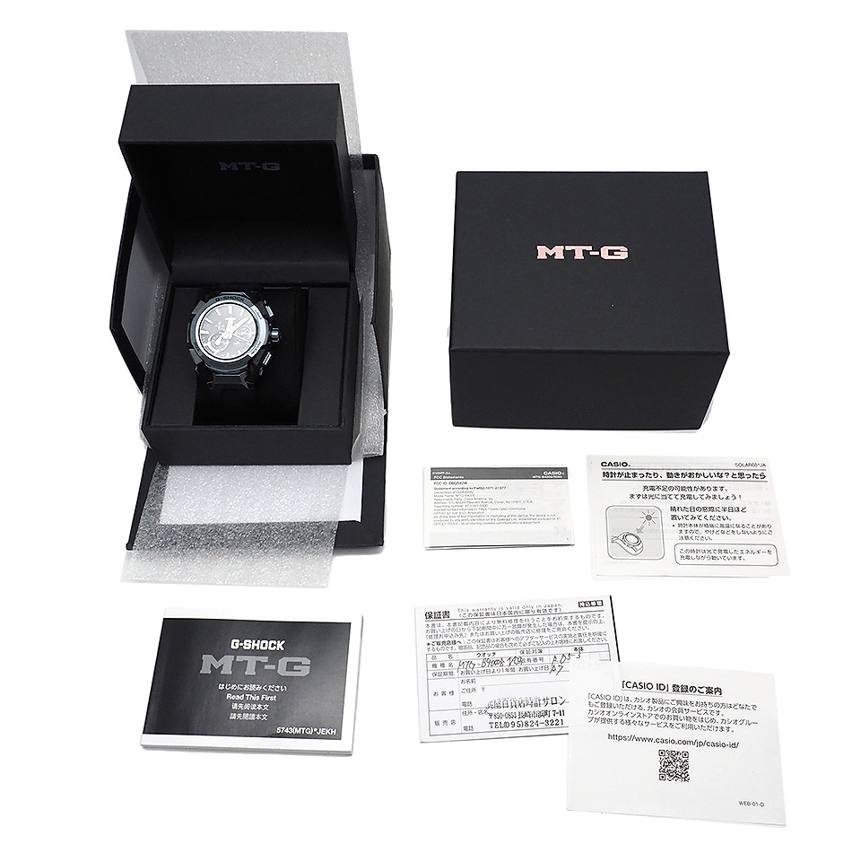 タフソーラー(ソーラー充電システム) 20気圧防水 トリプルGレジスト(耐衝撃構造・耐遠心重力性能・耐振動構造) カーボンコアガード構造 電波時計 日本・北米・ヨーロッパ・中国地域対応 MULTIBAND6 Bluetooth:スマートフォンと接続し時刻を自動修正 モバイルリンク機能(対応携帯電話とのBluetooth通信による機能連動) 自動時刻修正 簡単時計設定 ワールドタイム約300都市 タイム&プレイス 時計ステータス表示 セルフチェック 携帯電話探索 タイマー(セット単位:1秒、最大セット:24時間、1秒単位で計測、オートリピート) 報音フラッシュ機能(アラーム/時報/タイマー連動発光) 12/24時間制表示切替 フルオートカレンダー LEDバックライト(スーパーイルミネーター、残照機能付き) ワールドタイム:世界27都市(38タイムゾーン、サマータイム自動設定機能付き)+UTC(協定世界時)の時刻表示、ホームタイムの都市入替機能 ※スマートフォンとの連携により更新される場合があります。 タイマー(セット単位:1分、最大セット:24時間、1秒単位で計測) ストップウオッチ(1秒、24時間計) 時刻アラーム LEDライト(スーパーイルミネーター、残照機能付き) LED:ホワイト 電波受信機能:自動受信(最大6回 /日)(中国電波は最大5回/日)、 <日本>受信電波:JJY、周波数:40kHz/60kHz(福島/九州両局対応モデル) <北米地域>受信電波:WWVB、周波数:60kHz <ヨーロッパ地域>受信電波:MSF/DCF77、周波数:60kHz/77.5kHz <中国>受信電波:BPC、周波数:68.5kHz *ホームタイム設定を標準電波受信可能な時差に設定すると、時差に合わせた局を受信します。 ホームタイム都市(受信機能対応都市)/ 受信電波 東京/ 日本の標準電波JJY40・JJY60 ロサンゼルス、デンバー、シカゴ、ニューヨーク、ハリファックス/ アメリカの標準電波WWVB ロンドン、パリ、アテネ/ イギリスの標準電波MSF・ドイツの標準電波DCF77 G-SHOCKの起源である樹脂素材とメタル素材を融合して、革新的な構造美を追求するMT-Gシリーズ。 当サイトに掲載している商品は、店頭でも展示・販売している場合がございます。 そのため撮影時にはなかったダメージや劣化が生じることがございます。 詳細、ご不明な点は事前にお問い合わせください。 [N]0206 |