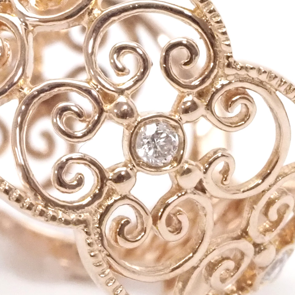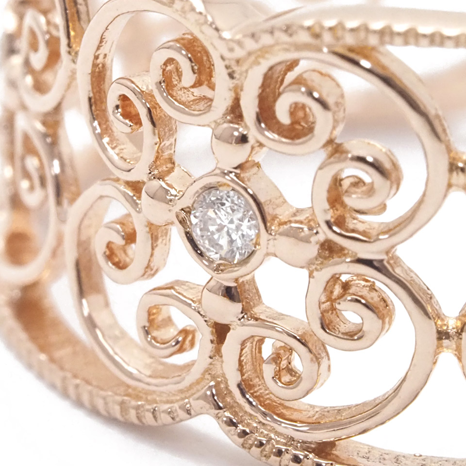 肌なじみの良いピンクゴールド製の細やかなデザインの指輪です。